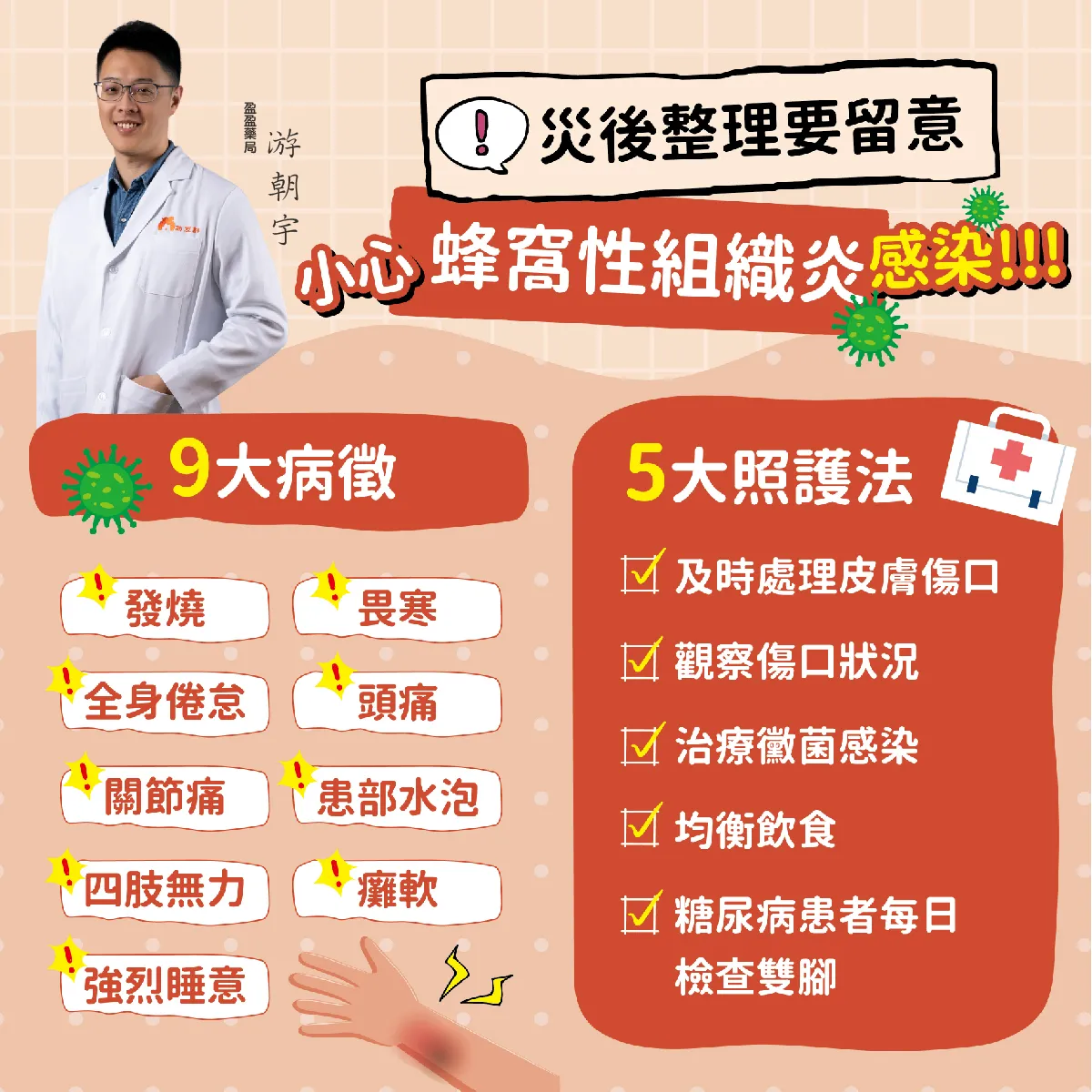 COVID-19來襲,該如何作好準備? 榮泰藥局 林幸穎藥師 /撰文整理 1.建議⾃主戴⼝罩 ▲一般民眾 ▪進入醫院、診所、長照機構等醫療照護機構,建議戴口罩,並配合醫療照護機構感控措施。 ▪搭乘大眾運輸工具或至人潮聚集的室內場所,建議戴口罩,特別是年長或有慢性病民眾。 ▲有發燒或呼吸道症狀的民眾 建議外出時戴口罩(直到症狀緩解後5天內),並盡量在家休息,避免不必要的外出。 2. 對新冠重症「8⼤警訊 」提高意識 ▪喘或呼吸困難 ▪⽪膚、嘴唇或指甲床發青 ▪無法進食、喝⽔或服藥 ▪過去24⼩時無尿或尿量顯著減少 ▪無發燒之情形下⼼跳 > 1 0 0次/分鐘 ▪收縮壓 < 9 0 mmHg ▪持續胸痛或胸悶 ▪意識不清 有以上症狀請務必立刻就醫 3.兒童的重症症狀 兒童的新冠症狀發生時,不易表達清楚,爸爸媽媽須提高警覺 ▪發燒超過48⼩時或⾼燒超39度,合併發冷冒冷汗,退燒後持續活動力不佳 ▪退燒後持續呼吸急促或喘、胸悶胸痛 ▪持續性嘔吐/頭痛或腹痛、超過12⼩時未進食或解尿,請儘速就醫 ▪若已出現抽搐、肌躍型抽搐、步態不穩、意識不佳 ▪或持續昏睡、呼吸困難或有胸凹現象、唇色發⽩或發紫、⾎氧飽和度低於9 4 %肢體冰冷合併⽪膚斑駁、冒冷汗、體溫⼤於41度等症狀時,請立即送醫治療 4.家中長輩及具重症風險因⼦對象 65歲以上長者、孕產婦或具慢性病史者,是感染新冠後可能導致併發症之⾼風險對象,如有發燒或呼吸道症狀請儘速就醫,以利醫師及早診治並開立抗病毒藥物,以降低感染後引發併發症或導致死亡之風險。 疾病管制署,自2025年6月11日起將該3類高風險對象(由醫師判定)之第2劑新冠JN.1疫苗之接種間隔建議,調整為與前1劑新冠JN.1疫苗間隔至少60天 5.新冠肺炎目前無特效藥,把握飲食原則,打造營養實力 良好的營養狀況可降低感染風險及提高疾病康復力,新冠疫苗可預防,仍需靠自身免疫力來戰勝病毒,因此保持均衡飲食,攝取充足營養是防疫重點工作。 1.用餐前務必正確清潔手部。 2.均衡飲食,食物多樣化 3.每天3-5份新鮮蔬菜、2-4份水果 4.攝取足量優質蛋白質食物 5.每日喝足量開水,協助體內代謝 6.「公筷母匙」,防疫措施不可或缺 7.堅持安全的飲食習慣,食用肉類和蛋類要煮熟,應避免生食。