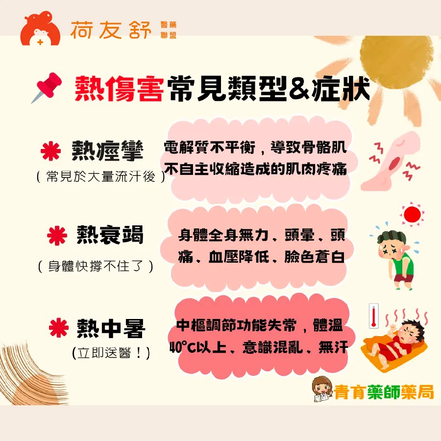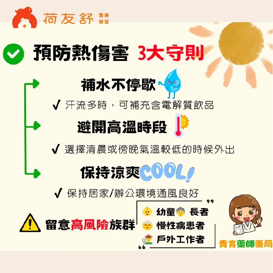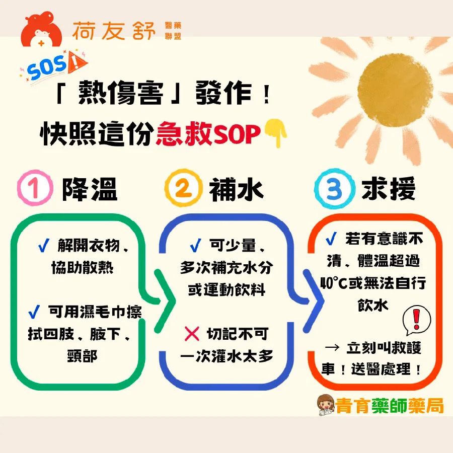 夏天來了~小心熱傷害找上門! 青育藥師藥局 許青育藥師提醒你:別讓酷暑擊倒你! 記得遵守《預防熱傷害3大守則》👇 ✅ 補水不停歇:多流汗時,可補充電解質飲品 ✅ 避免高溫時段:選擇清晨或傍晚較涼的時候外出 ✅ 保持涼爽:居家/辦公環境要保持通風良好 ⚠️高風險族群請特別注意!包括: 👶幼童、👵長者、😷慢性病患者、👷戶外工作者 若發現熱傷害發作,請立刻啟動急救SOP🚨: ① 降溫:脫衣散熱、濕毛巾擦拭四肢、腹部、頸部 ② 補水:少量多次補充水或運動飲料,避免一次灌水太多! ③ 求援:如有意識不清、體溫超過40℃或無法自行喝水, 👉 請立刻叫救護車!送醫處理! 🌞認識熱傷害,保護自己與家人,轉發分享給你關心的人 ❤️ 📌快收藏這份「熱傷害防中暑懶人包」,一起安穩過夏天~ 感謝青育藥師藥局 提供圖片 #青育藥師藥局 #熱傷害 #中暑 若有其他疑問 歡迎至 #荷友舒醫藥聯盟 全台聯盟藥局藥局藥師將會貼心的協助各位民眾 或者也可以至 #荷友舒問藥室 線上詢問 聯盟藥局位置:https://pharmhoyosu.com.tw/Location 荷友舒問藥室:https://lihi1.me/8QRN6 -荷友舒醫藥聯盟- IG:https://www.instagram.com/youshu202310/ LINE:https://lin.ee/RgBPIee TIKTOK:https://www.tiktok.com/@user7819436817405 YOUTUBE:https://www.youtube.com/channel/UCzgxPAbQjSdPXl7fEZ0jo6Q